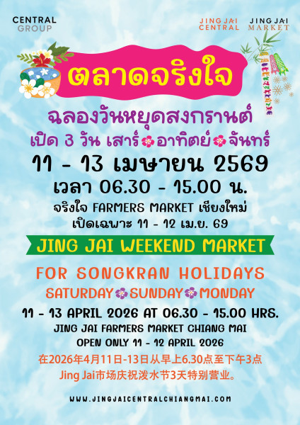 เมษาม่วนใจ๋ ตลาดจริงใจเปิดฉลองวันหยุดสงกรานต์ วันเสาร์ที่ 11 - วันจันทร์ที่ 13 เมษายน 2569 เวลา 06.30 น. – 15.00 น. จริงใจ Farmers Mark..