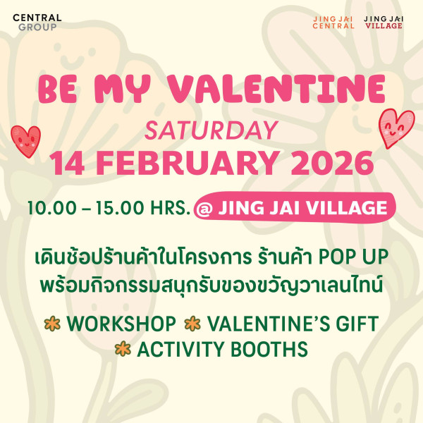 ต่อด้วยความหวานในวันพิเศษ Be My Valentine วันเสาร์ที่ 14 กุมภาพันธ์ 2569 10.00 น. – 15.00 น. โครงการจริงใจวิลเลจ เดินช้อปข..