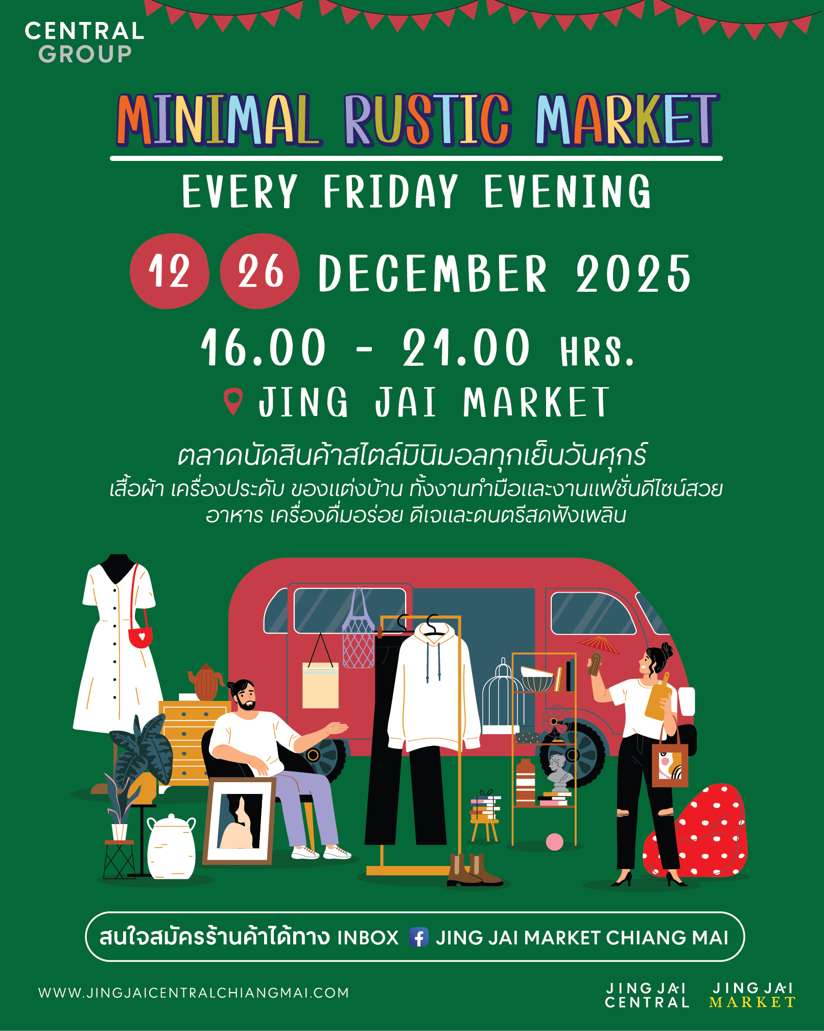 ชวนช้อปสินค้าสไตล์มินิมอล ทั้งเสื้อผ้า กระเป๋า เครื่องประดับ ของแต่งบ้าน งานศิลปะ อร่อยกับฟู้ดทรัก ของกินเล่น และเครื่องดื่ม พร้อมเพลิดเพลินกับเพลงฟังสบายในบรรยากาศยามเย็นท่ามกลางลมหนาวของช่วงต้นปี ที่บริเวณสวนหย่อมหน้า Tops Green โครงการจริงใจมาร์เก็ตเชียงใหม่ ของกลุ่มเซ็นทรัล